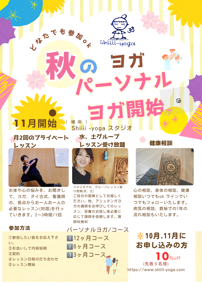 🌟パーソナルヨガ開講~⤴️ パーソナルヨガは個人レッスンでご自身のお体の悩みにあわせたレッスンを行って行きます。 お体だけでなく、心の悩みにも焦点をおきお体の不調から解放出来るよう、サポートを行います。 ヨガだけでなく、看護師としての知識、タイ古式での身体の状態、健康相談を行い、改善できる所にポイントをおいていきます。 サービスの内容は、チラシをご覧下さい。 10月、11月に、お申し込みの方 10%offさせて頂きます。 人数制限ございます。お早めのお申し込み下さい。 ~コース一覧~ ~値段検討中~ 変更あるかもしれません。。。 ○12ヶ月コース(600000円)→540000 ○6ヶ月コース(360000円)「人気No.1」→ 324000 ○3ヶ月コース(180000円)→162000 ○2ヶ月コース(120000円)→108000 |
