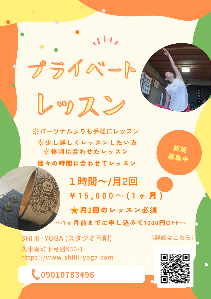 | 🌟パーソナルヨガ開講~⤴️ パーソナルヨガは個人レッスンでご自身のお体の悩みにあわせたレッスンを行って行きます。 お体だけでなく、心の悩みにも焦点をおきお体の不調から解放出来るよう、サポートを行います。 ヨガだけでなく、看護師としての知識、タイ古式での身体の状態、健康相談を行い、改善できる所にポイントをおいていきます。 サービスの内容は、チラシをご覧下さい。 10月、11月に、お申し込みの方 10%offさせて頂きます。 人数制限ございます。お早めのお申し込み下さい。 ~コース一覧~ ~値段検討中~ 変更あるかもしれません。。。 ○12ヶ月コース(600000円)→540000 ○6ヶ月コース(360000円)→ 324000 ○3ヶ月コース(180000円)→162000 ○2ヶ月コース(120000円)→108000 |